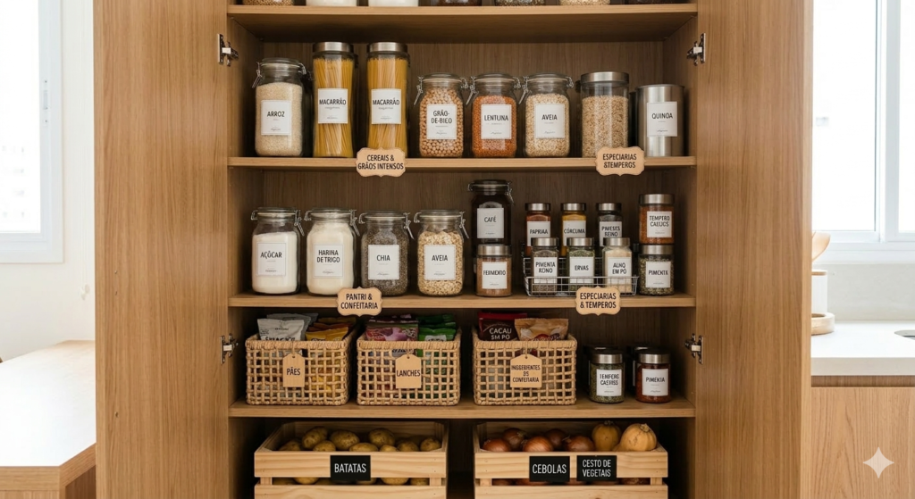 Guarde alimentos semelhantes juntos, como massas, enlatados, temperos e grãos. Isso facilita na hora de encontrar o que você precisa.