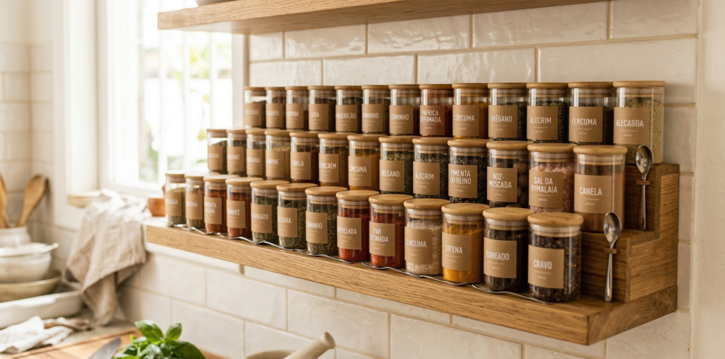 Também é interessante separar os temperos por tipo, como ervas, pimentas e temperos secos. Essa divisão facilita encontrar cada item rapidamente.